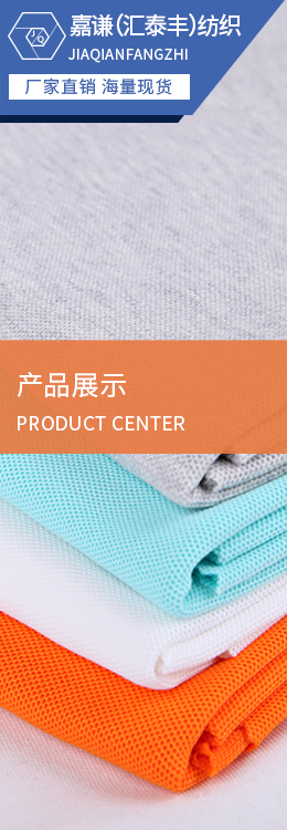平紋布:各類拉架平紋、普通平紋、花式平紋,面料紋路清晰、光澤好,成分包括100C、100T、100N、T/C、CVC、N/C、N/T、MODAL、TENCEL、ROYAN、BAMBOO等,適宜合類休閑、運(yùn)動、時(shí)尚、商務(wù)及內(nèi)衣類服飾.<br /> 珠地布:各類單雙珠、六角、斜紋珠地,珠眼飽滿、顆粒清晰,伸縮保形性好,吸濕、透氣,可兼做抗紫外、吸濕導(dǎo)汗、香味等功能,適宜各類休閑、商務(wù)、運(yùn)動類T恤.<br /> 健康布:組織精密、紋路清晰、手感爽滑立挺,膚感強(qiáng),適宜各類運(yùn)動、休閑、時(shí)尚類服裝,成分包括100C、100T、T/C、CVC、C/R等.<br /> 衛(wèi)衣布:各類單、雙衛(wèi)衣,拉架衛(wèi)衣,布面肌理豐富,耳仔整齊,立體飽滿,有良好的吸濕透氣及保暖功能.<br /> 不倒絨:保暖、透氣,不起球、不掉毛,適宜合類休閑套裝,情侶、新套裝、保暖內(nèi)衣.<br /> 橫機(jī)面料:11、22及提花類,用于各類領(lǐng)袖及下欄配套.<br/>